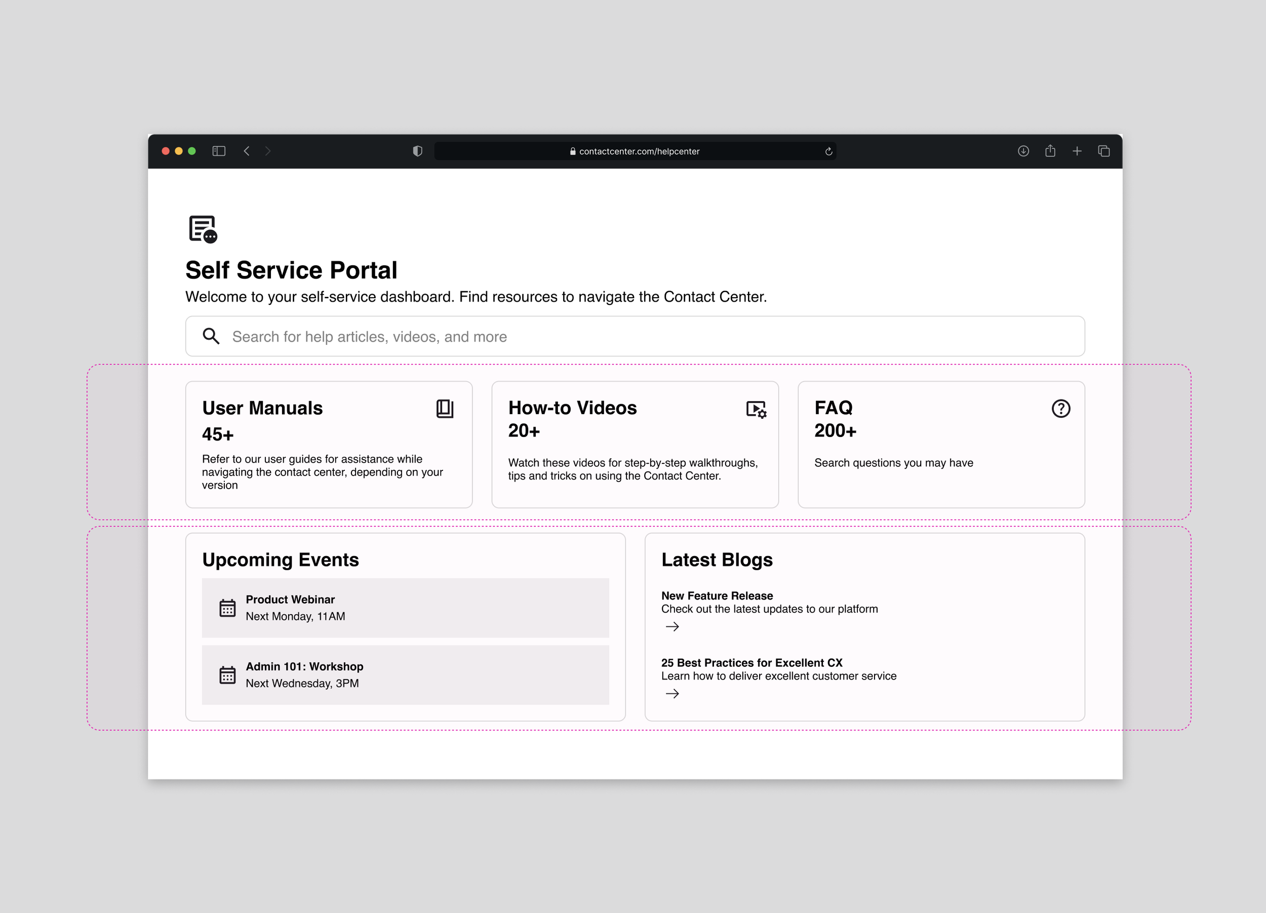 I designed a self-service portal for a B2B contact center platform so agents could find guides, FAQs, and updates in one place thus reducing repeat support requests and support team workload.